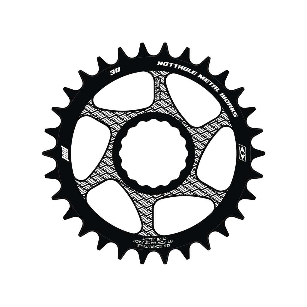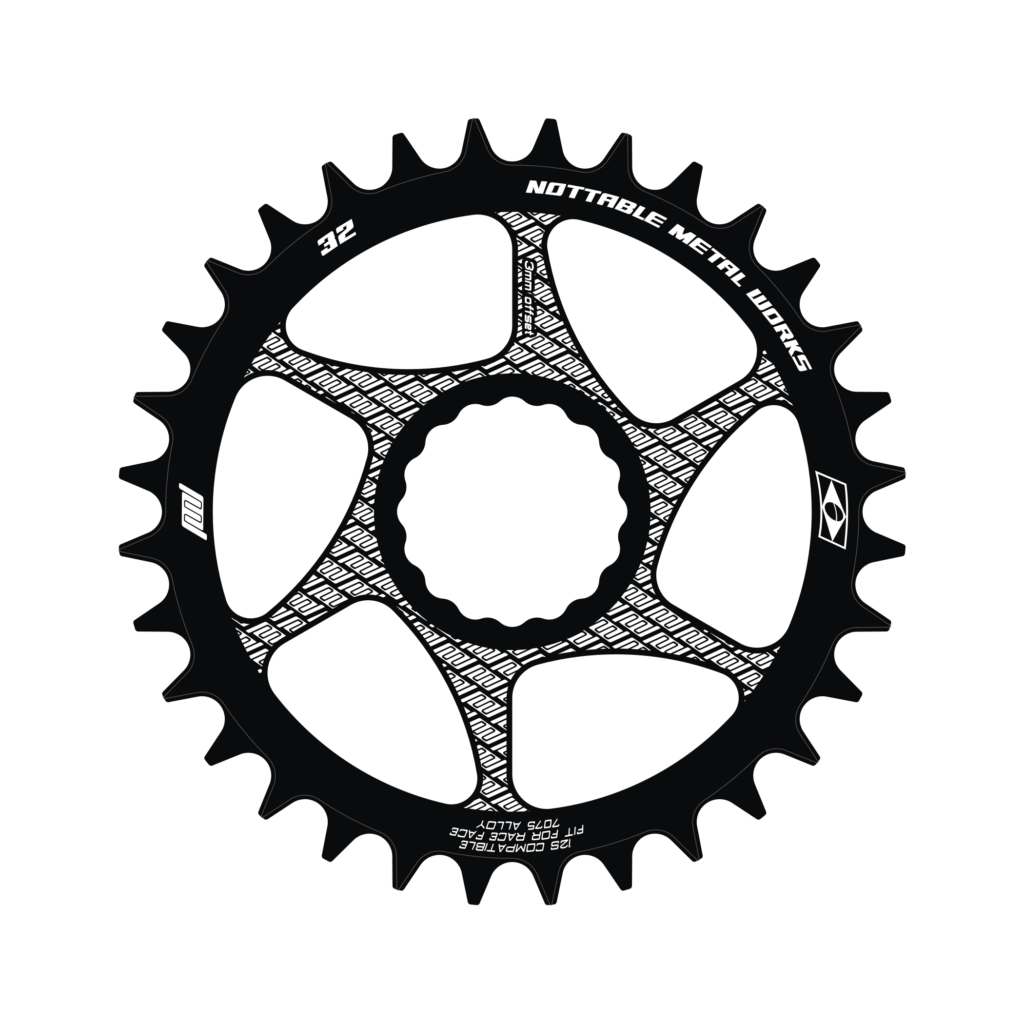 Coroa Direct Mount em alumínio 7075, compatível com pedivelas Race Face. Suporta sistemas de 9v a 12v, oferecendo opções de 28 a 38 dentes e offset de 3mm.